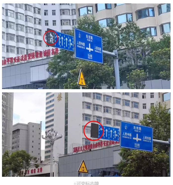 路口的可變標(biāo)志牌會根據(jù)潮汐車道的變更,顯現(xiàn)與之相對應(yīng)的指示標(biāo)志,便于過往車輛識別通行。