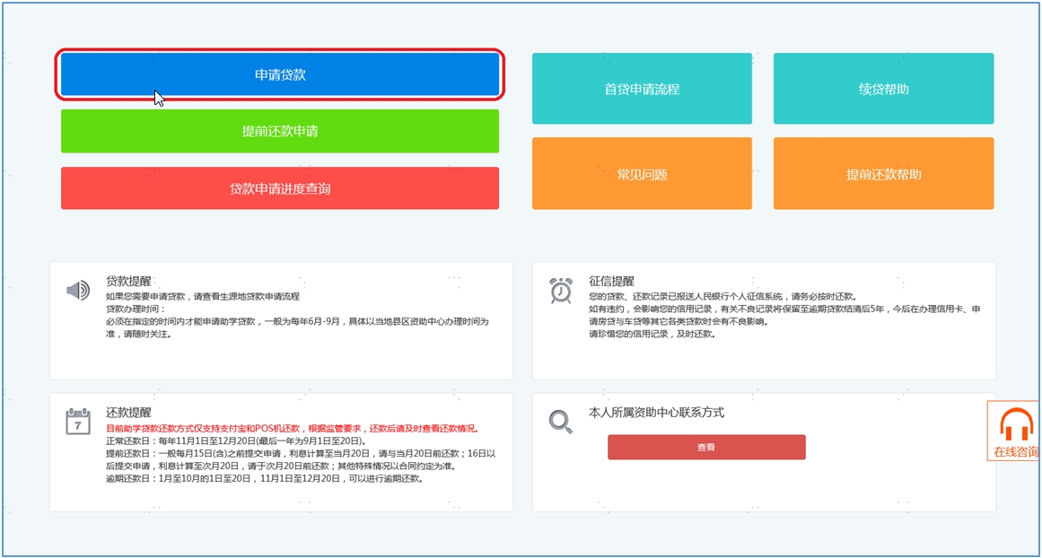 2.登錄在線系統(tǒng)后,點(diǎn)擊‘申請貸款’