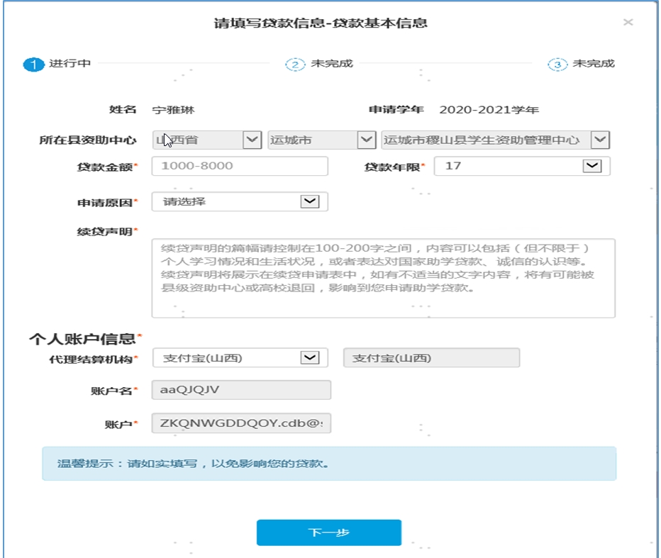 注:該部分內(nèi)容學(xué)生進(jìn)行貸款金額填寫、貸款年限選擇、續(xù)貸申明填寫(務(wù)必按要求填寫,填寫內(nèi)容不適或不合要求可由縣資助中心老師將該學(xué)生本次申請審核退回),其它項(xiàng)為系統(tǒng)自動取值。