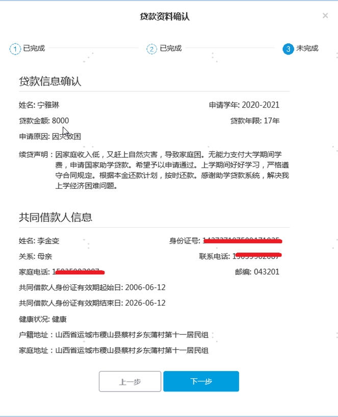 6.填寫共同借款人信息后,點(diǎn)擊“下一步”對貸款資料進(jìn)行確認(rèn)。