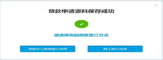 7.確認(rèn)貸款資料無誤,點(diǎn)擊“下一步”提交貸款材料,系統(tǒng)彈出“貸款申請資料保存成功”,并提示貸款簽訂方式選擇。