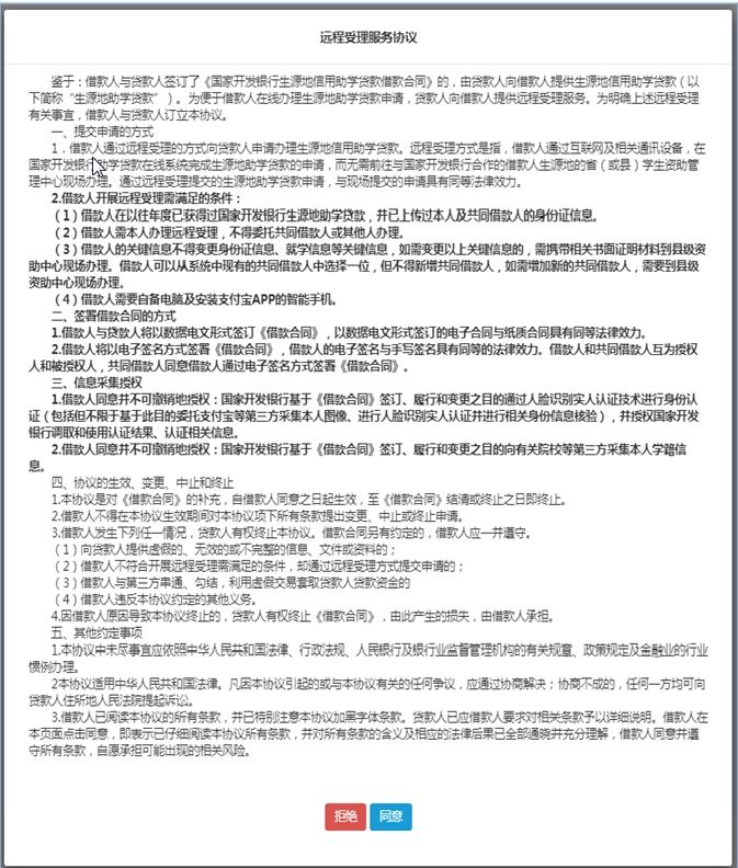 注:點(diǎn)擊拒絕后則返回“請選擇您的貸款簽訂方式”,續(xù)貸學(xué)生可以重新選擇“資助中心現(xiàn)場簽訂合同”進(jìn)行線下辦理。
