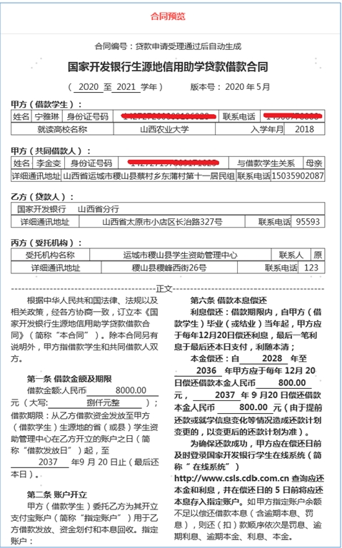 每年10月25日至12月10日為固定還款日,包括利息和分期償還的本金(最后一筆本金和利息于合同到期日償還)。學(xué)生在校及畢業(yè)后5年期間為寬限期,寬限期滿后按等額本金方式分期償還貸款本金,寬限期滿當(dāng)年12月10日償還第一筆本金,若畢業(yè)或結(jié)業(yè)后剩余還款期限小于5年的則按《借款合同》約定還款。