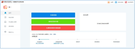 申請完貸款后,首頁會顯示貸款進(jìn)度條,顯示該貸款申請的進(jìn)度,申請進(jìn)度主要有5個(gè)節(jié)點(diǎn)分別為:在線提交、現(xiàn)場受理、審批中、審批通過、發(fā)放到高校。