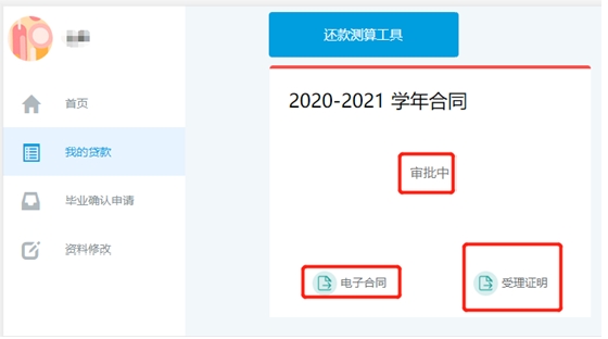 當(dāng)縣資助中心老師審核成功后,會給續(xù)貸學(xué)生發(fā)送貸款辦理成功與回執(zhí)驗(yàn)證碼短信,續(xù)貸學(xué)生可登錄學(xué)生在線系統(tǒng)查看并打印電子合同和貸款受理證明。