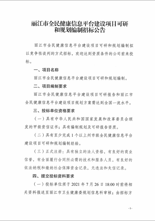 麗江市全民健康信息平臺(tái)建設(shè)項(xiàng)目可研和規(guī)劃編制招標(biāo)公告