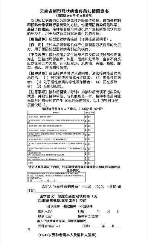特別聲明:15~17歲人群接種時須攜帶本人身份證(沒有身份證的帶戶口本)及監(jiān)護人身份證,由監(jiān)護人陪同到疫苗接種點接種疫苗。接種現場各班班主任也會在現場,若不能到現場簽字的家長(監(jiān)護人),請在班級群里回復“某某學生家長,已認真閱讀云南省新型冠狀病毒疫苗知情同意書,因本人原因,不能到現場簽字,請委托某某老師代簽(監(jiān)護人簽字一欄),發(fā)生的一切后果由家長自行承擔,與簽字老師無關”。