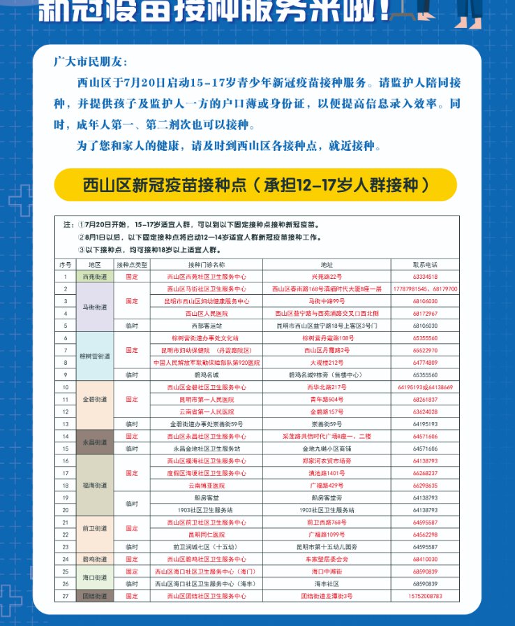 溫馨提示:目前西山區(qū)新冠病毒疫苗充足,18歲以上成年人可以前往以下接種點(diǎn)進(jìn)行第一、第二劑次的接種。西山轄區(qū)內(nèi)的居民和未成年人,請(qǐng)就近在西山轄區(qū)內(nèi)接種。全民免疫屏障的早日構(gòu)建需要全民的共同努力,為了您的健康,請(qǐng)盡快接種!