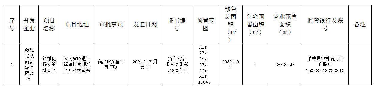 根據(jù)《中華人民共和國城市房地產(chǎn)管理法》、《城市商品房預售管理辦法》、《住建部房屋交易與產(chǎn)權管理工作導則》、《云南省城市房地產(chǎn)開發(fā)交易管理條例》、《昭通市人民政府關于調整第二批行政職權事項的決定》(昭政發(fā)〔2019〕20號)等相關法律法規(guī)規(guī)定,現(xiàn)將鎮(zhèn)雄縣住房和城鄉(xiāng)建設局2021年7月29日受理并辦理鎮(zhèn)雄億聯(lián)商貿城有限公司鎮(zhèn)雄億聯(lián)商貿城A區(qū)《商品房預售許可證明》情況予以通告如下: